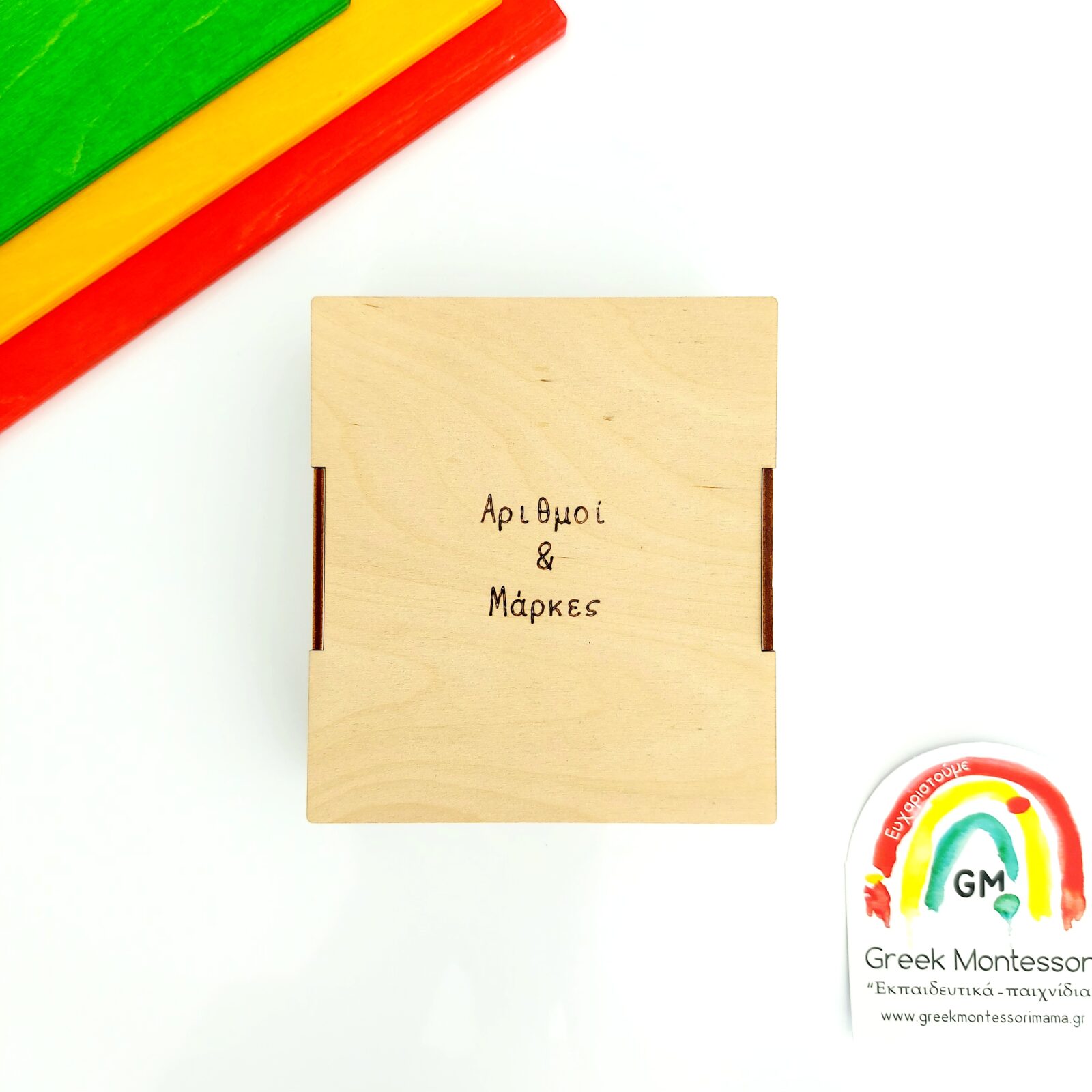 Ξύλινο εκπαιδευτικό παιχνίδι εμπνευσμένο από την μοντεσσοριανή φιλοσοφία με αριθμούς και μάρκες για την εκμάθηση ποσοτήτων με τους αντίστοιχους αριθμούς.