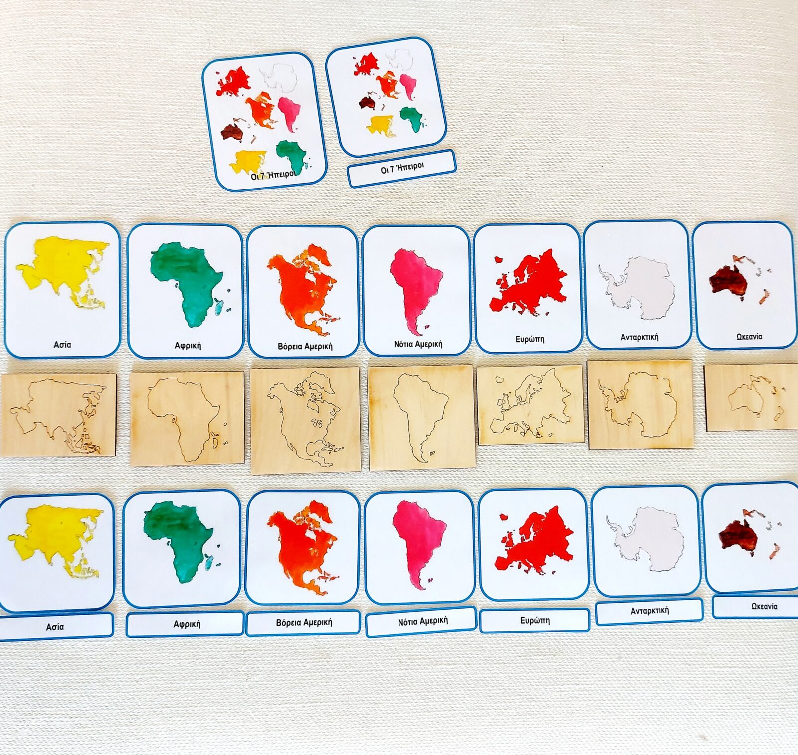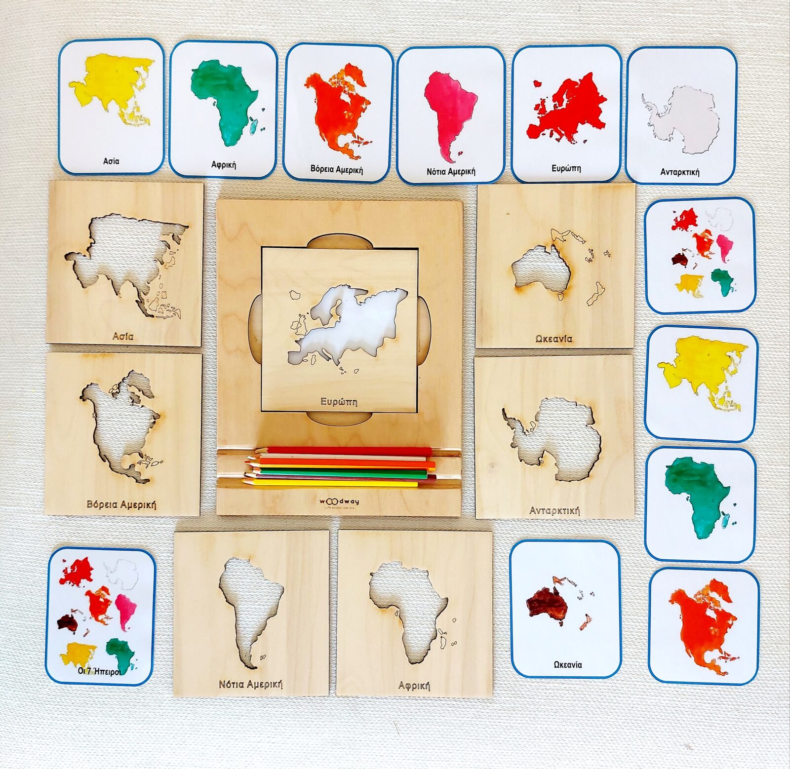 Το βασικό σετ γεωγραφίας αποτελείται από 7 ξύλινα ένθετα (στένσιλ) κάθε ένα εκ των οποίων σχηματίζει μια Ήπειρο. Το παιδί μπορεί να σχηματίσει κάθε Ήπειρο στην εσοχή κάθε ενθέτου.