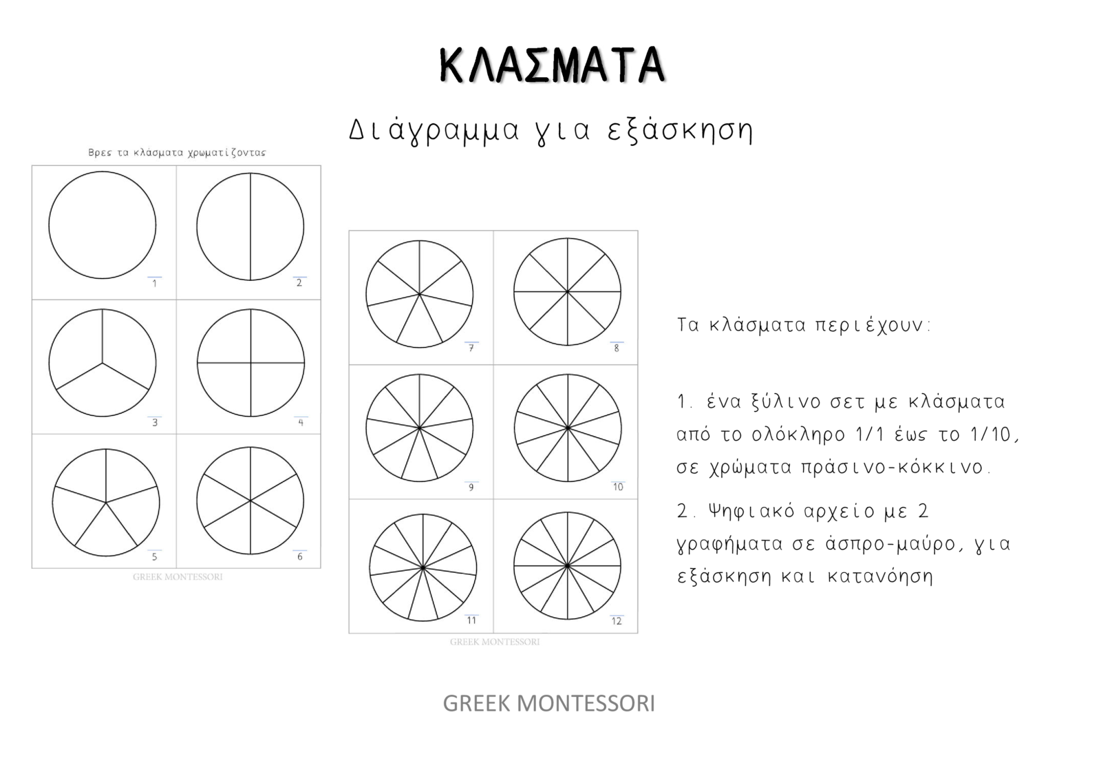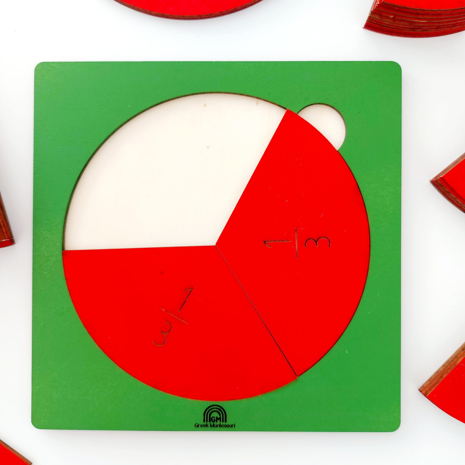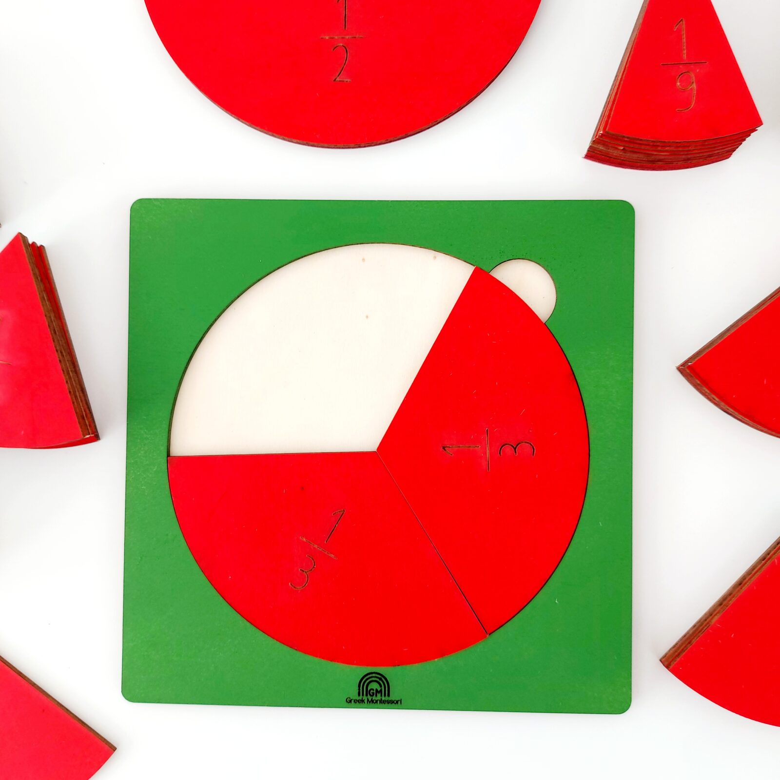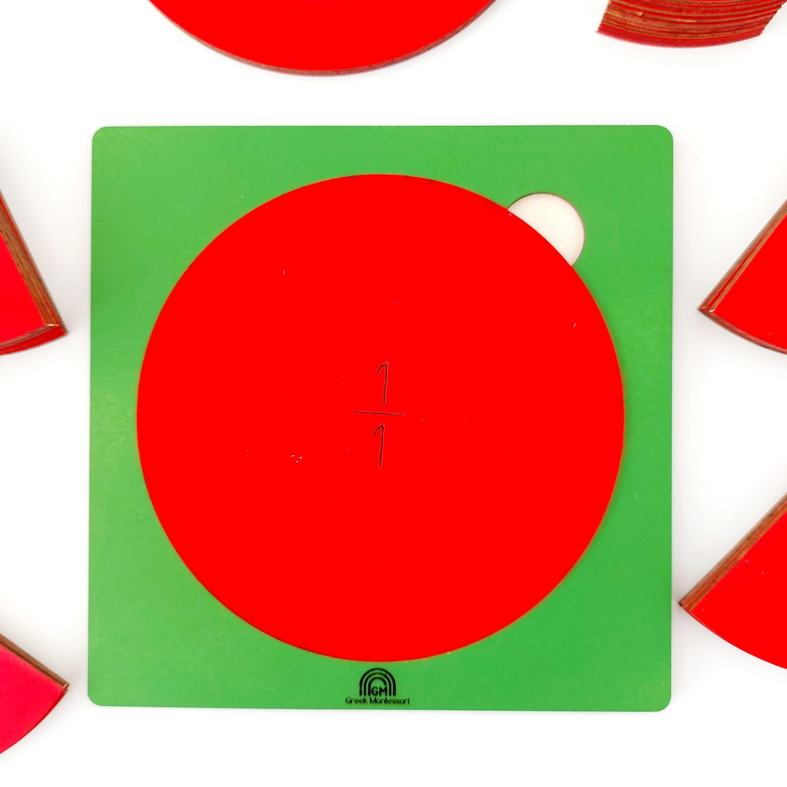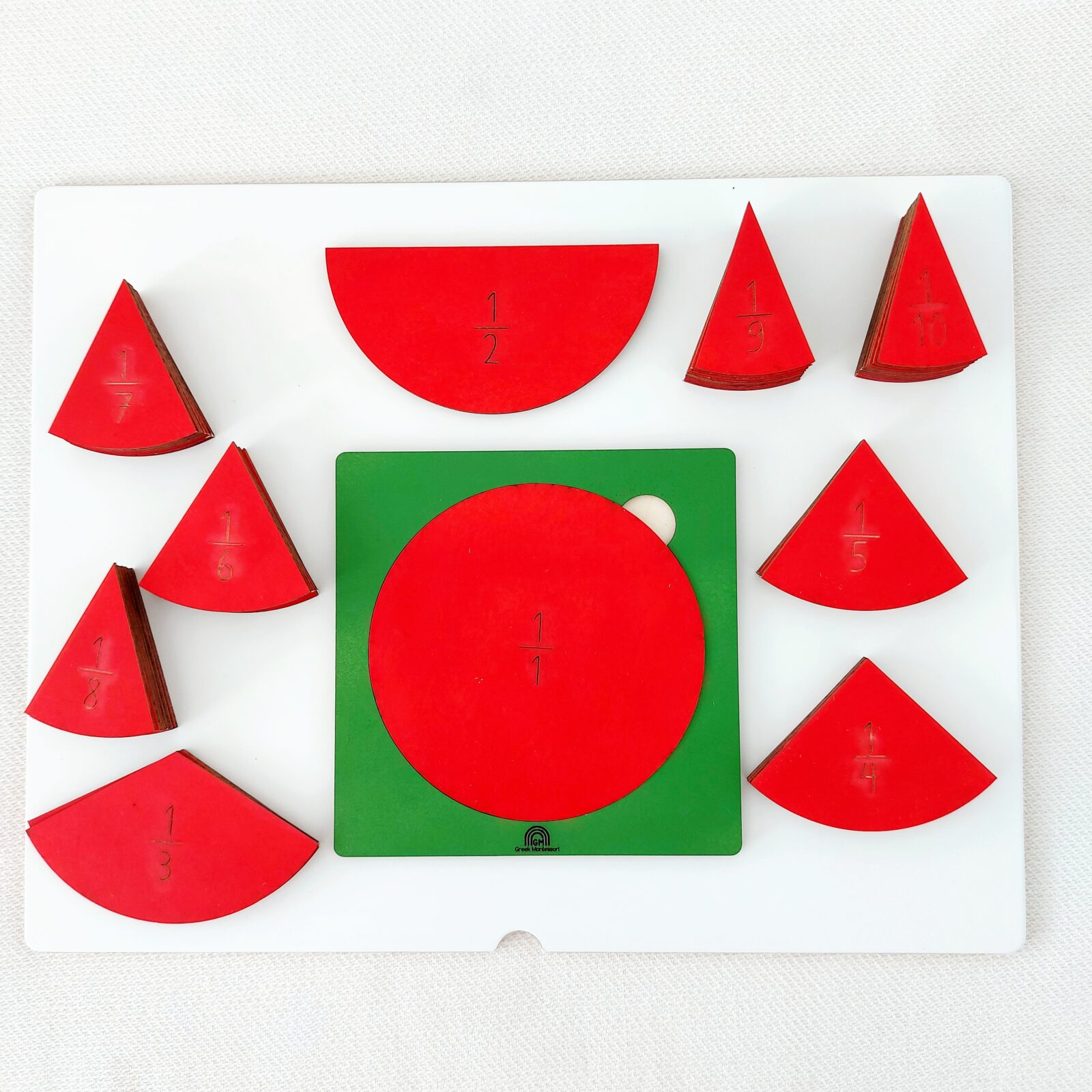 - ένα ξύλινο σετ με κλάσματα από το ολόκληρο 1/1 έως το 1/10, σε χρώματα πράσινο-κόκκινο, διαστάσεων 25χ25 εκ. από ξύλο κόντρα πλακέ θαλάσσης.