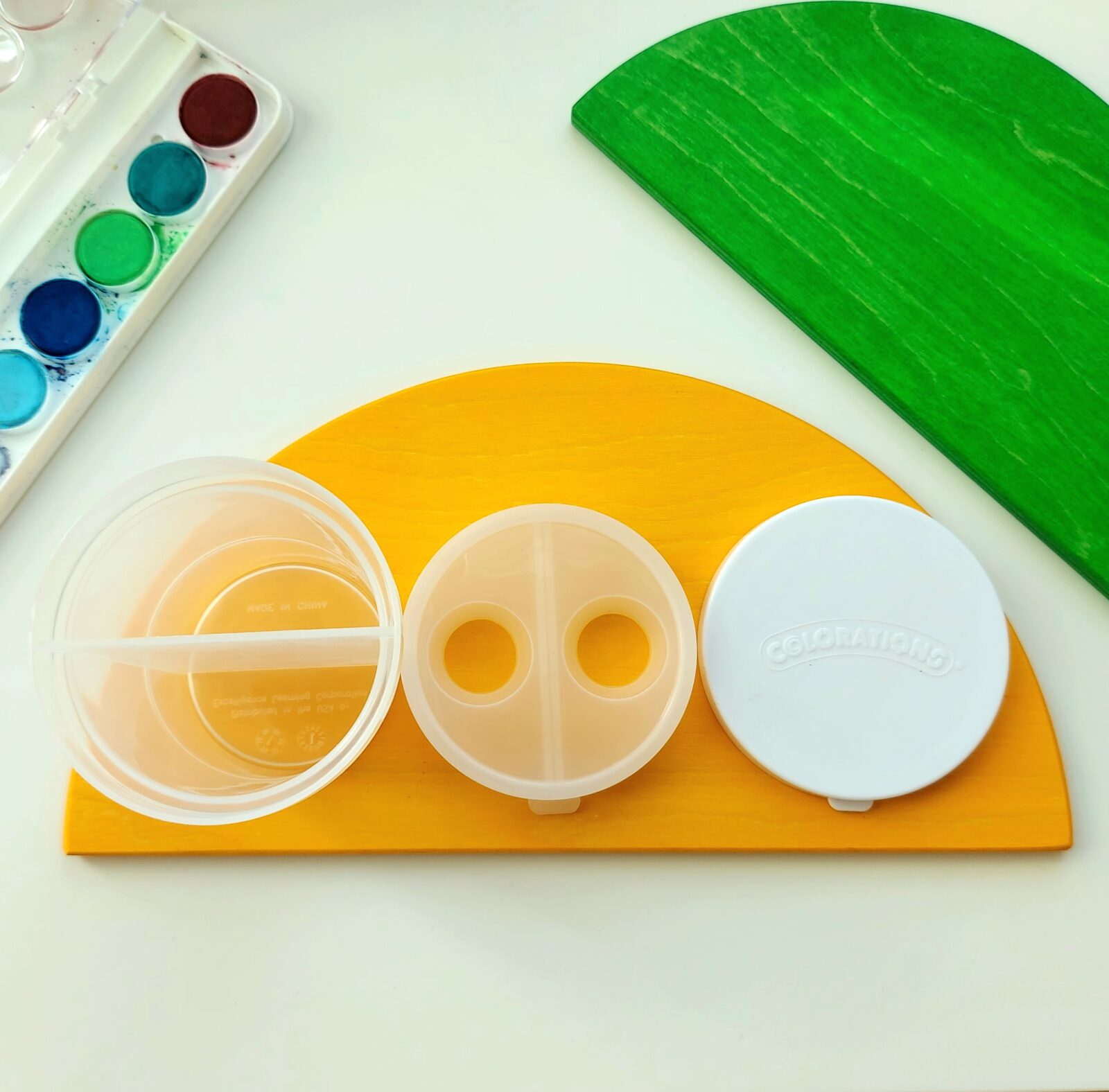 Περιέχει εσωτερικά διαχωριστικά που χωρίζουν το κυπελάκι σε 2 μέρη, στα οποία μπορεί να μπει υγρό χρώμα όπως τέμπερες ή γιαούρτι με χρώμα ή ακόμα και νερό για να ξεπλένεται το πινέλο δίχως να λερώνεται ο χώρος ζωγραφικής.