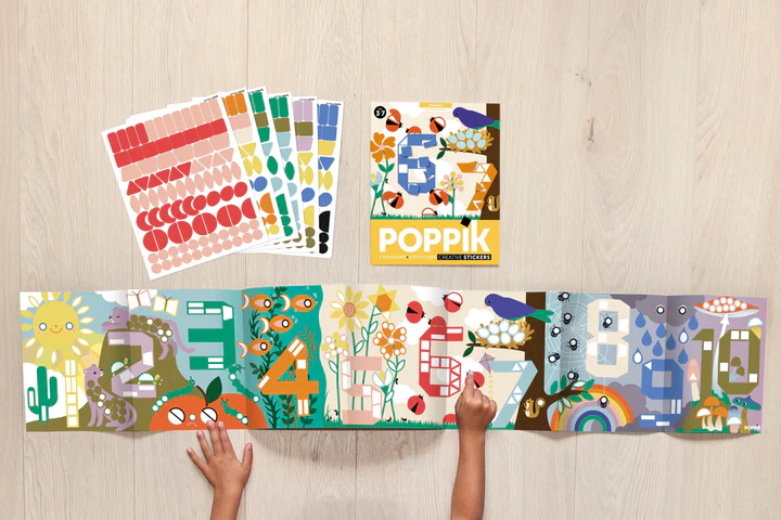 Ένας πολύ δημιουργικός τρόπος για να μάθει το παιδί να μετράει ως το 10. Κάθε νούμερο συνδέεται και με ένα στοιχείο της φύσης, κάποιο ζώο ή φυτό. Το παιδί κολλάει τα σωστά σχήματα στο σωστό σημείο ακολουθώντας έναν χρωματικό κώδικα και συνθέτει την μια πολύχρωμη εικόνα φυσικού τοπίου. Είναι κατασκευασμένο στη Πολωνία από την Beci Orpin για την εταιρεία Poppik.