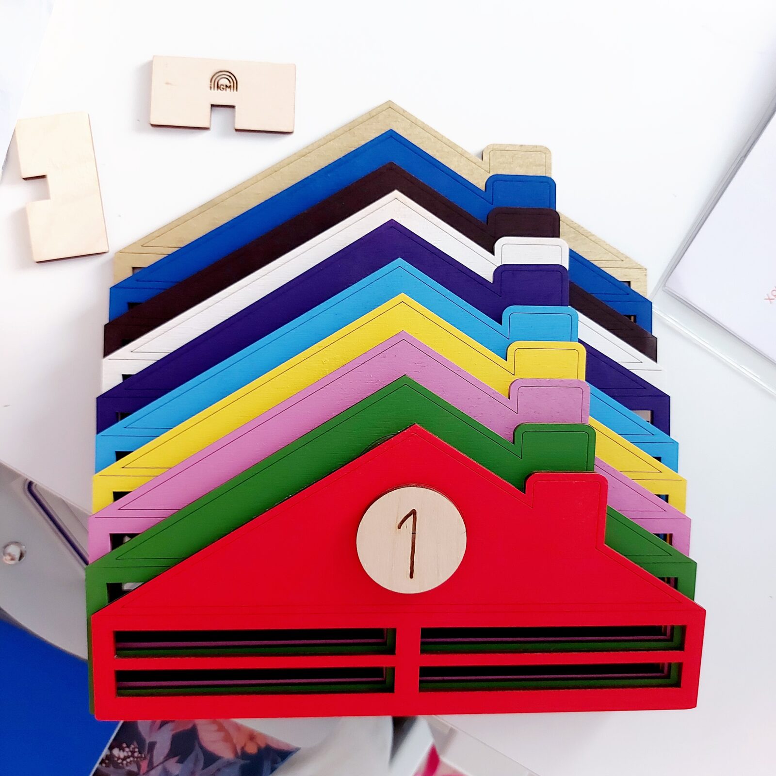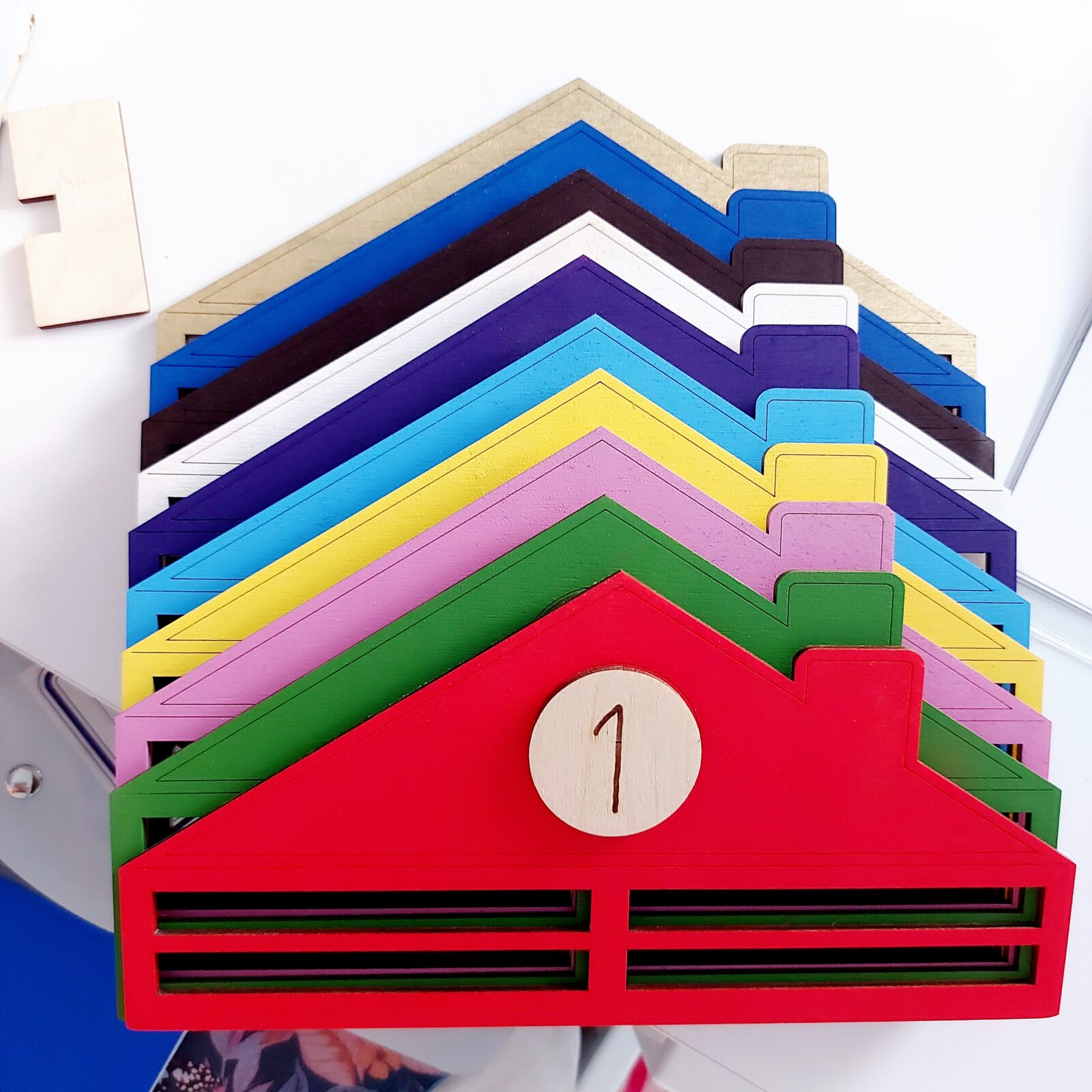 10 ξύλινα σπιτάκια αριθμών, από ξύλο σημύδας, βαμμένα με διαφορετικά χρώματα (τα χρώματα είναι κοινά με αυτά που έχει η μοντεσσοριανή μέθοδος)